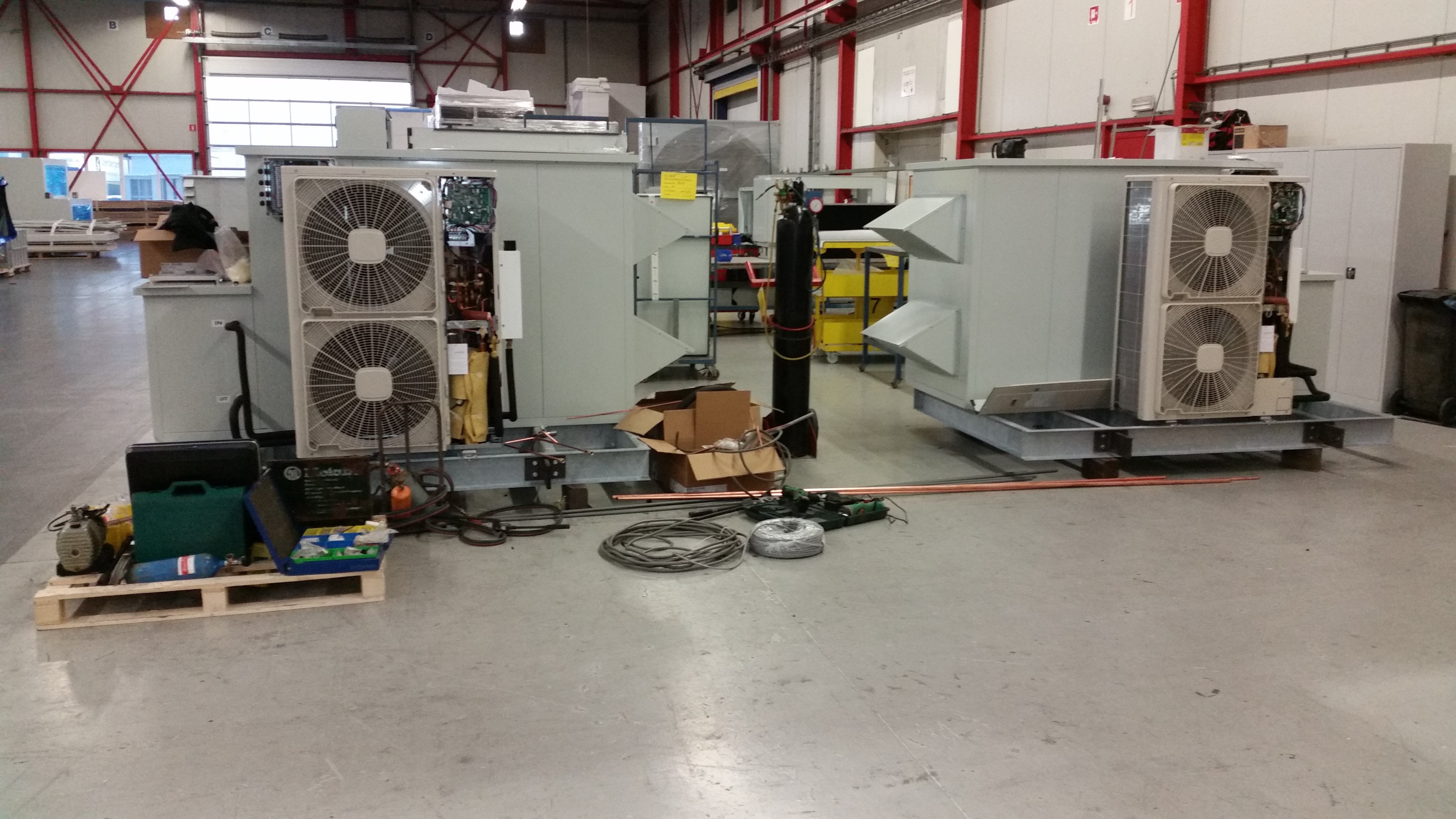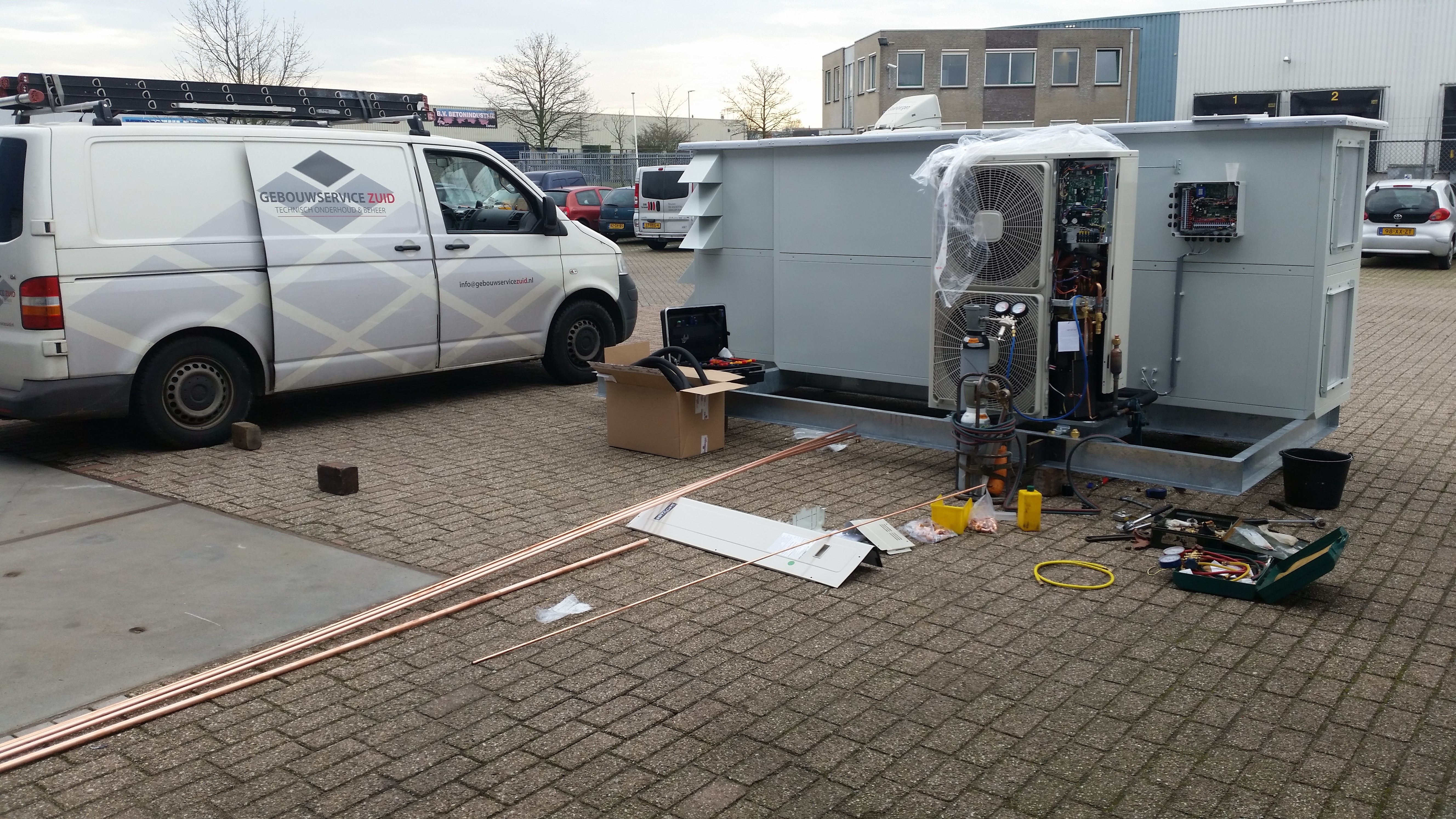 GebouwService Zuid is een samenwerking aangegaan met Verhulst en HD klimaatsystemen. Verhulst heeft de luchtbehandelingskast geleverd, HD Klimaatsystemen heeft de airco-unit geleverd en GebouwService Zuid heeft de kennis en kunde geleverd om beide toestellen te verbinden. Op locatie bij OC Verhulst Klimaattechniek hebben wij in opdracht van HD Klimaatsystemen de koeltechnische en elektrotechnische werkzaamheden geleverd om beide installaties te koppelen.Het geheel kan nu als 1 toestel rechtstreeks bij de klant worden afgeleverd. De installateur behoeft enkel nog de voeding aan te sluiten en de installatie kan in bedrijf worden genomen.